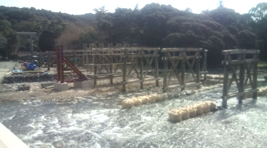 現在、入り口の宇治橋が20年に一度の架け替えを行っています